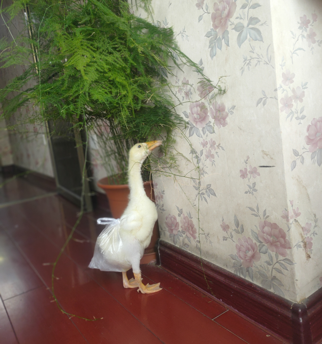 真的遭不住了,孩子要养的鸭,越养越大,活得好好的,现在只好给鸭鸭穿塑料袋。
